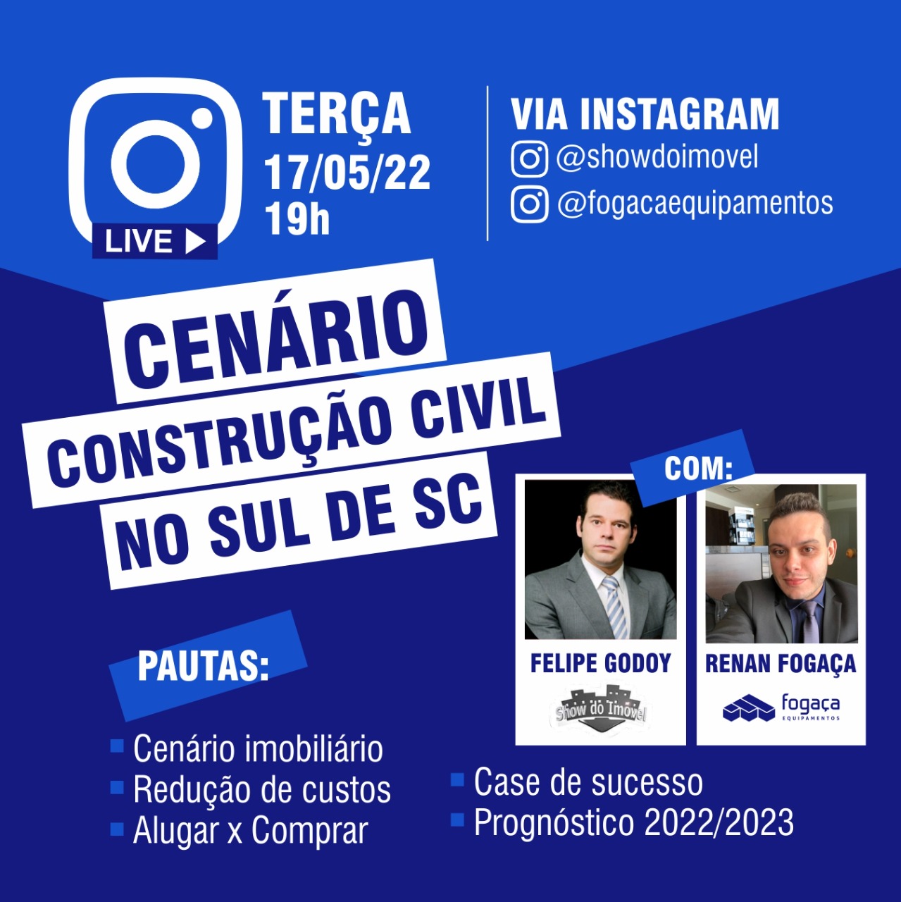 Uma conversa com o prognóstico do que deverá acontecer com o setor da construção civil no segundo semestre. Como um dos líderes da Associação Brasileira dos Locadores de Equipamentos, a Alec, o empresário da Fogaça Equipamentos, Renan Fogaça, será o convidado especial para o debate: “Cenário da Construção Civil no Sul de SC”. A live, via Instagram, acontece nesta terça, às 19h, pelas redes do @showdoimovel e Fogaça Equipamentos.