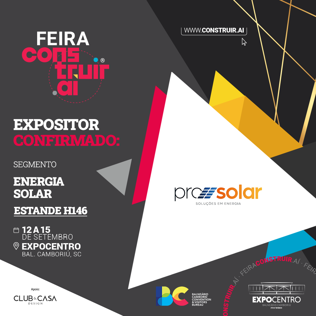 A ProSolar, que é expositora confirmada na Feira Construir Aí, que ocorre entre os dias 12 e 15 de setembro de 2023, no Expocentro, em Balneário Camboriú, atende os estados de Santa Catarina e Rio Grande do Sul.